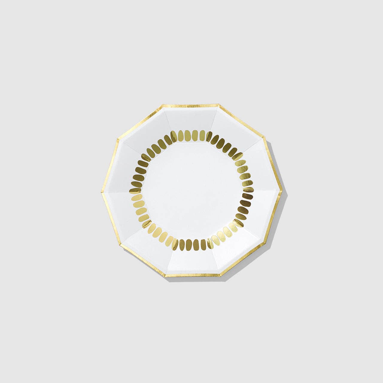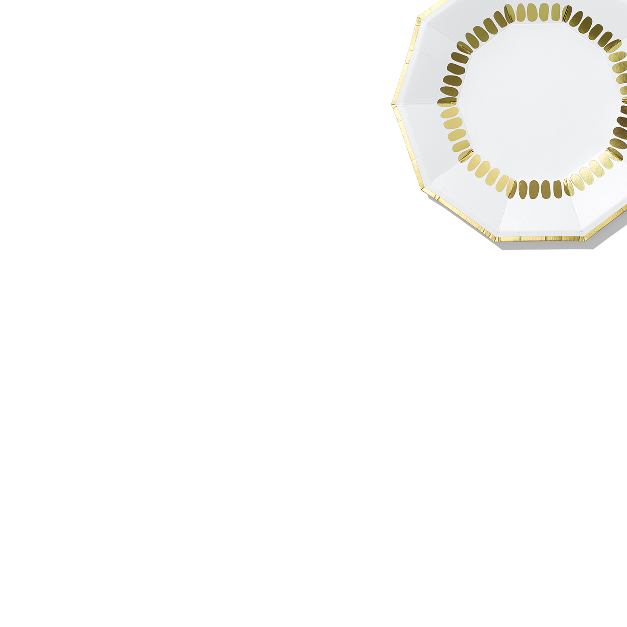 Equal parts decadent and minimalist, these glittery small plates pair white and gold to unforgettable effect. Includes 10 plates. Details * 7.25" paper plates * Pack of 10 * Recyclable and compostable * Extra sturdy - grab that extra slice of cake!